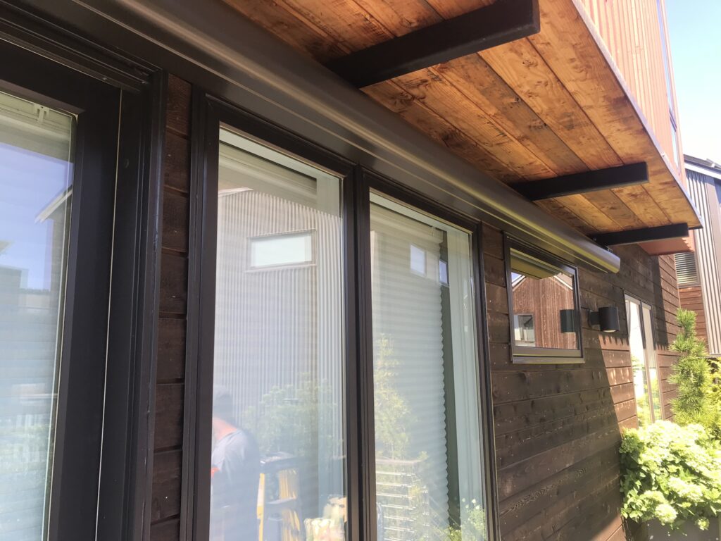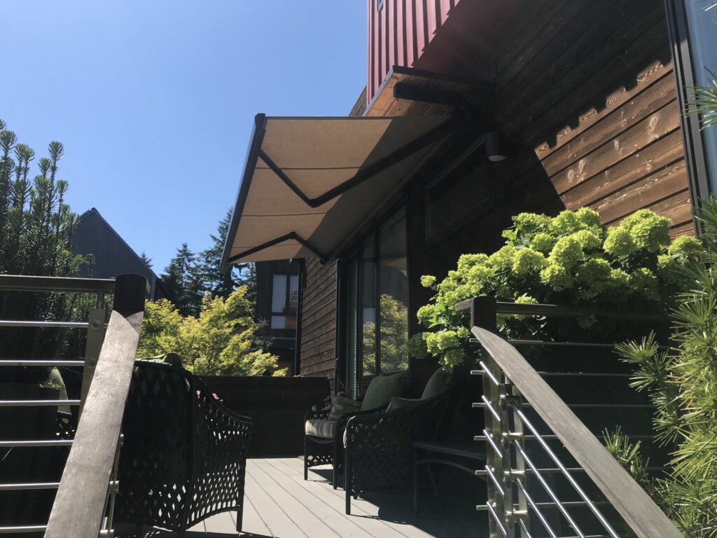 We can make your awning disappear! If you are looking for a more subtle rain or shade solution, a cassette style retractable awning might be right for you. The cassette casing closes fully, leaving no visible fabric and in some cases can totally disappear when not in use. This Casabox awning blends in perfectly with the siding on this modern home.