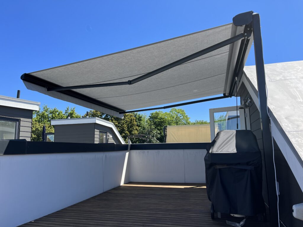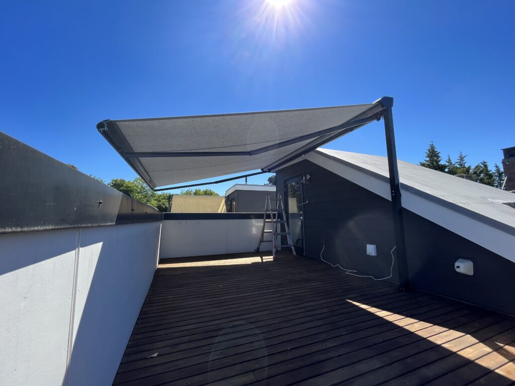 Modern townhomes are incredibly popular and most include a sunny rooftop deck, however very few include a shade solution for hot days. Awkward stairways and strict city code often mean there aren’t many options for adding awnings or freestanding structures. In this project we made a custom frame to help support a retractable awning and make this sunny space more usable.
